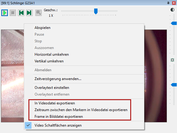 Wenn Sie eine Videosequenz oder einzelne Bilder ohne die Messdaten exportieren wollen, dann können Sie die Exportbefehle Ihnen im Kontextmenü des Videofensters nutzen.