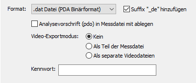 Beim Export einer Messdatei (DAT-Datei) können Sie die Videos als Bestandteil der Messdatei oder als separate Videodatei exportieren. Für den zu exportierenden Teil der Messdatei werden die relevanten Videosequenzen komprimiert und in der neuen Messdatei abgespeichert.
